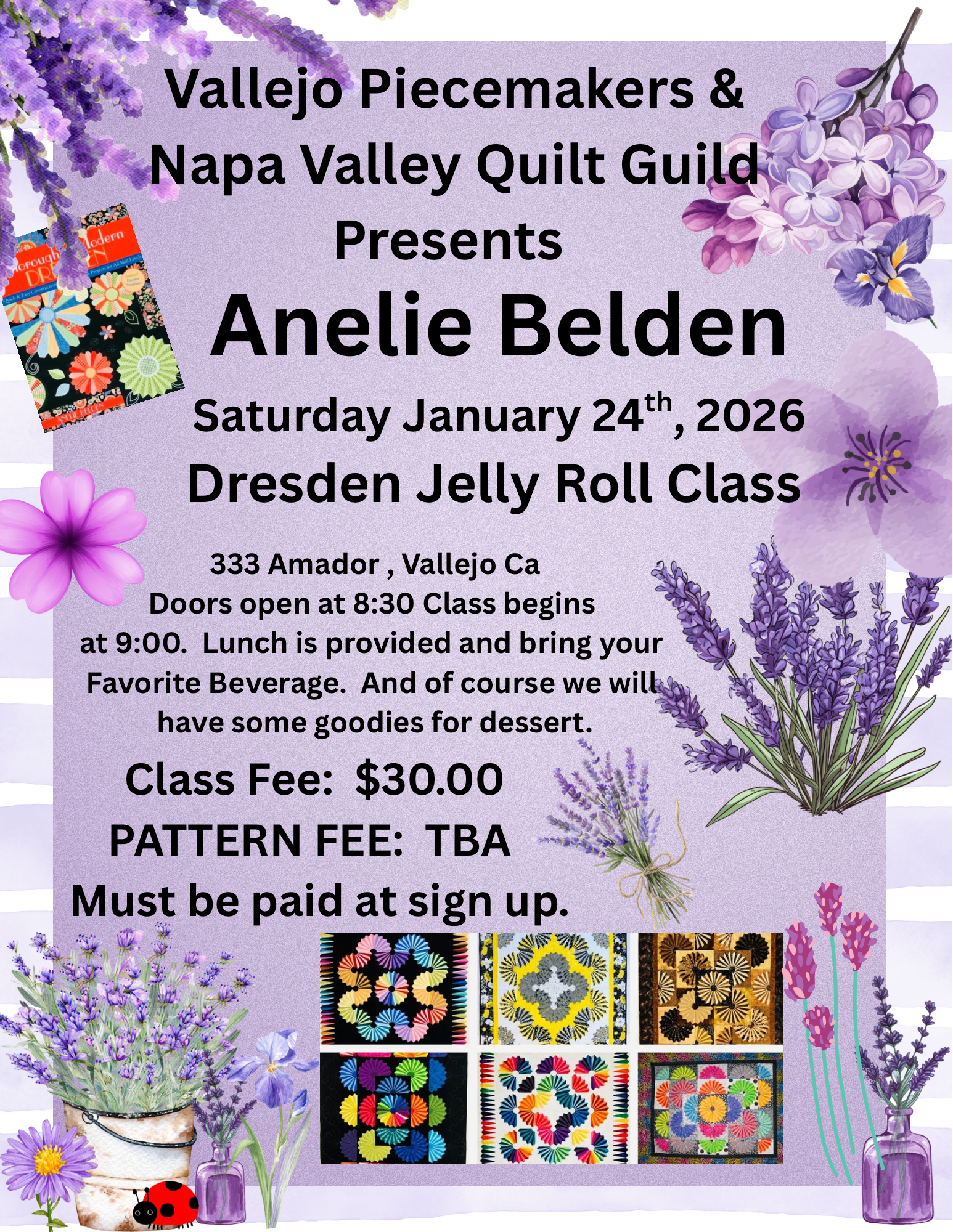 Vallejo Piecemakers & Napa Valley Quilt Guild Presents Anelie Belden's Dresden Jelly Roll Class • Doors open at 8:30 am, Class begins at 9:00 am. • Lunch is provided and […]